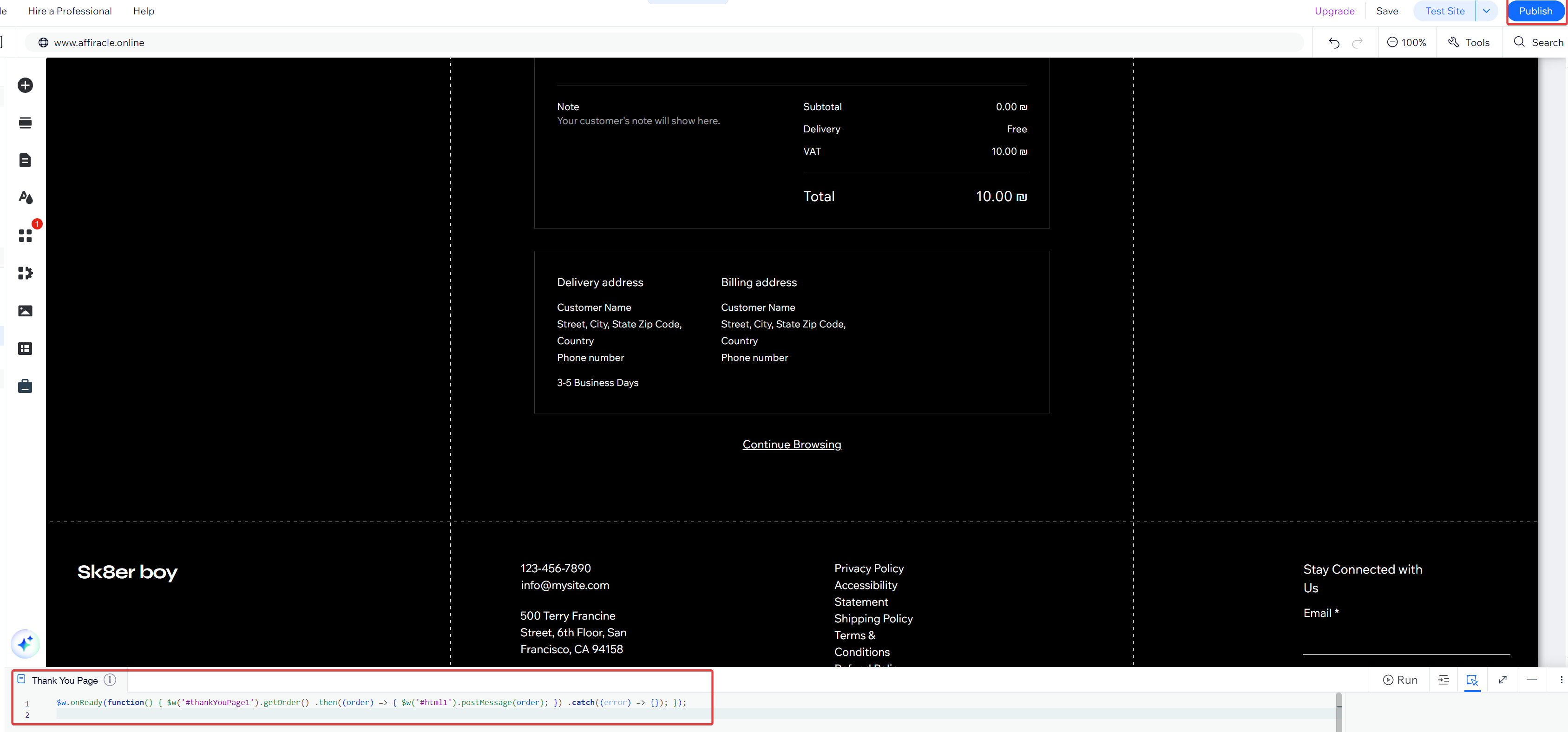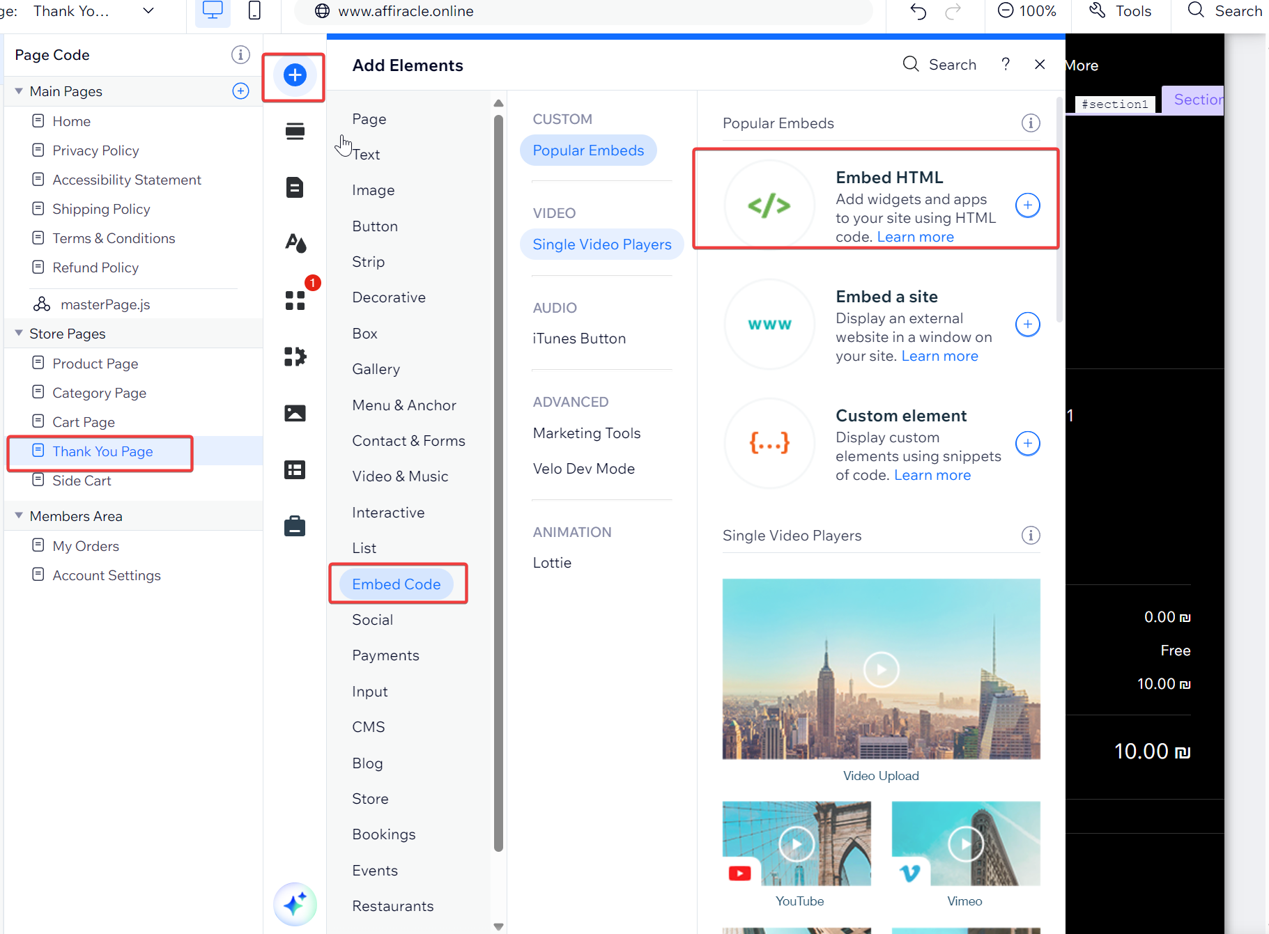 <script src="https://affiracle.com/wix-custom-code.js"></script>- שם הקוד: Affiracle Embed - Thank You Page