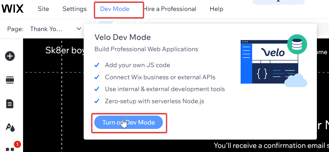 - בתוך עורך ה-Wix לחצו על כפתור Dev Mode והפעילו אותו אם עדיין לא פעיל.